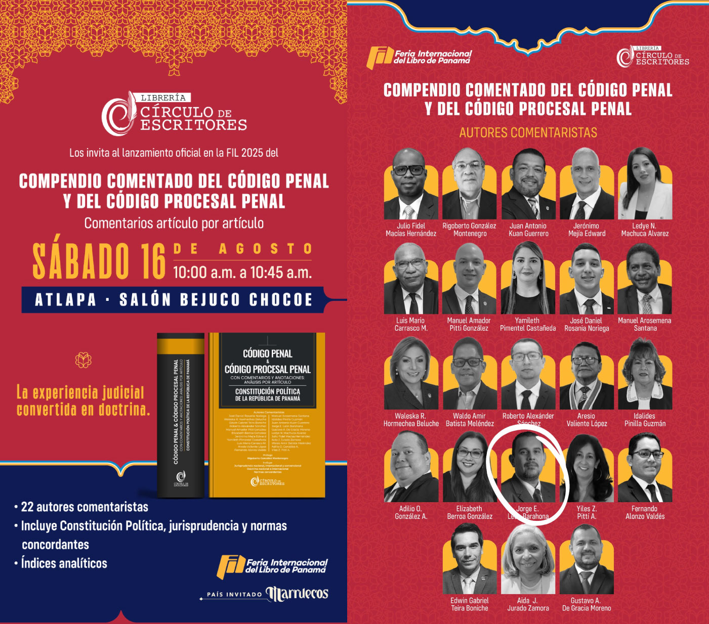 - El 16 de agosto de 2025, en el marco solemne de la Feria Internacional del Libro de Panamá, y bajo el sello editorial Círculo de Escritores, vio la luz el Compendio comentado del Código Penal y del Código Procesal Penal con comentarios y anotaciones: análisis por artículo.